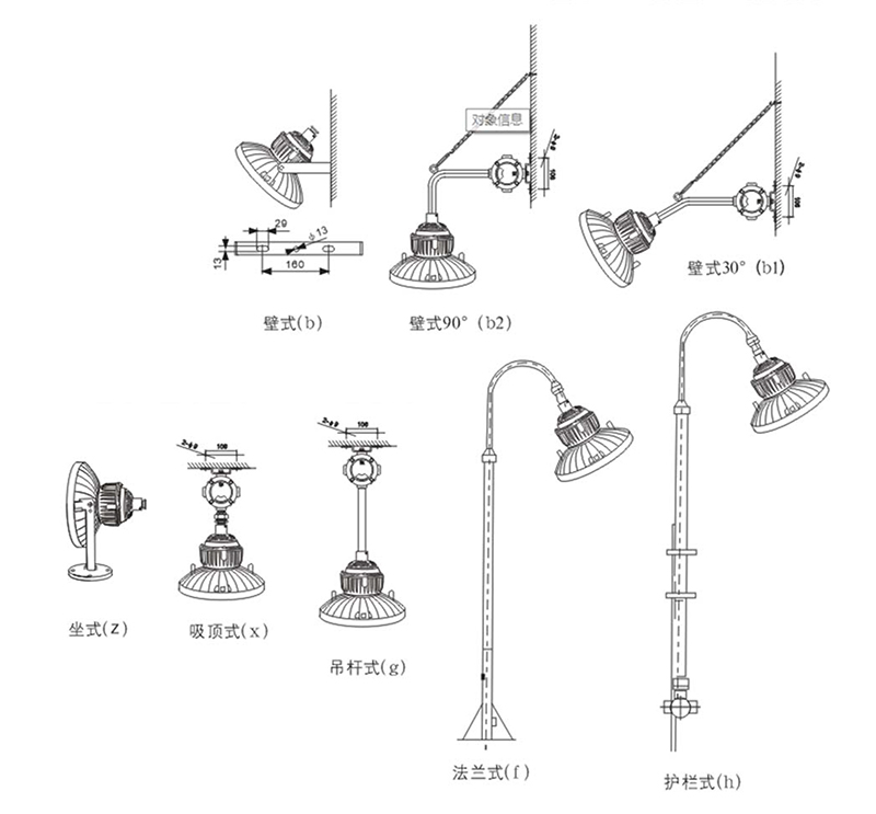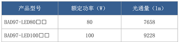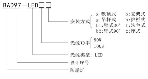 > 按照產(chǎn)品型號(hào)規(guī)格說(shuō)明逐條選擇并注明防爆標(biāo)志,例如:需要防爆 LED 投光燈 100W 規(guī)格,坐式安裝,則產(chǎn)品型號(hào)為 BAD97-LED100z ExdⅡCT4