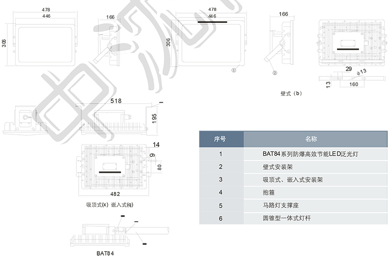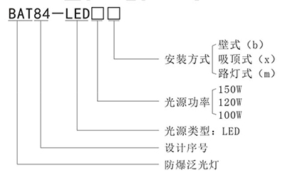 > ?按照產(chǎn)品型號規(guī)格說明逐條選擇并注明防爆標(biāo)志,例如:需要防爆 LED 泛光燈 100W 規(guī)格,則產(chǎn)品型號為 BAT84-LED100;