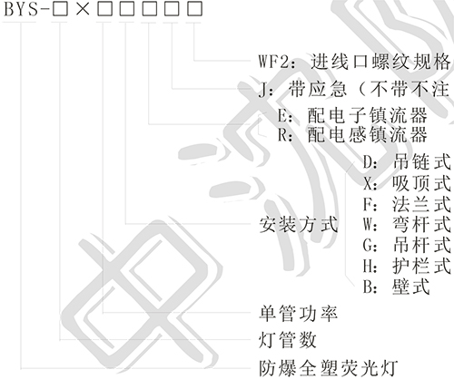 安裝方式:吊鏈?zhǔn)剑―)、吸頂式、(X)、法蘭式(F)、彎桿式(W)、吊桿式(G )、護(hù)欄式(H)、壁式(B )