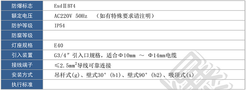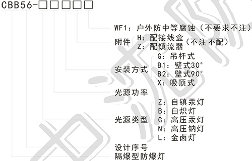 >?按照產(chǎn)品型號規(guī)格說明逐條選擇并注明防爆標(biāo)志,例如:需要金鹵燈 175W,吸頂式安裝則產(chǎn)品選型為:CBB53-L175X ExdⅡBT4;
