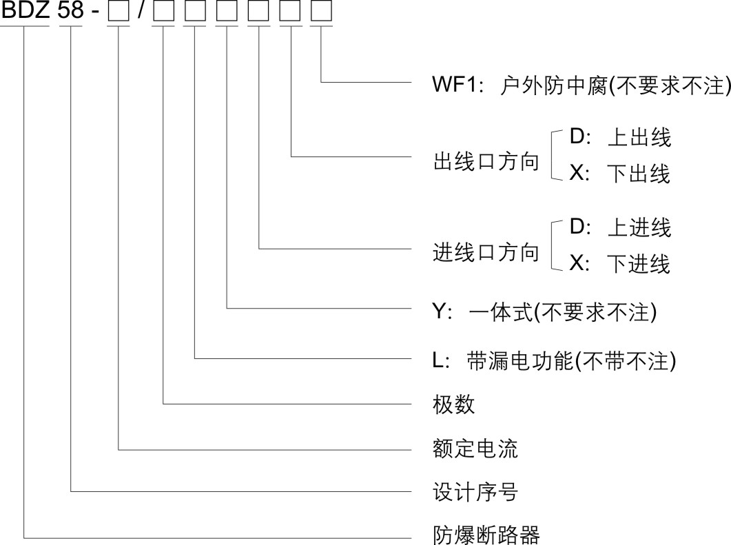 > 例如:需要 10A、3 級(jí)、下進(jìn)下出,則產(chǎn)品型號(hào)為 BDZ58-10/3XX。