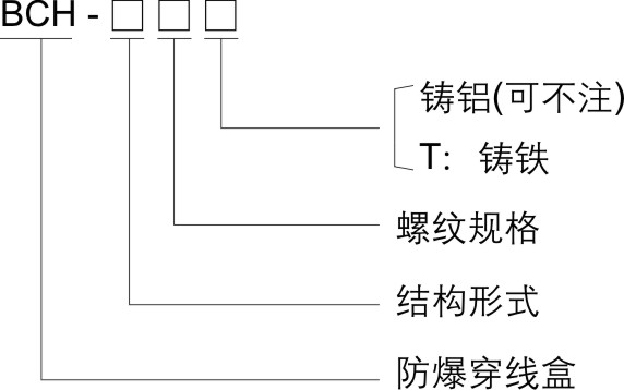 > 按照產(chǎn)品型號逐條選擇并注明防爆標(biāo)志及結(jié)構(gòu)形式、螺紋規(guī)格等參數(shù),例如:需要增安型鑄鋼 G1″A 型穿線盒,則產(chǎn)品型號為 BCH-AG1″T ExeⅡC Gb/Ex tD A21。